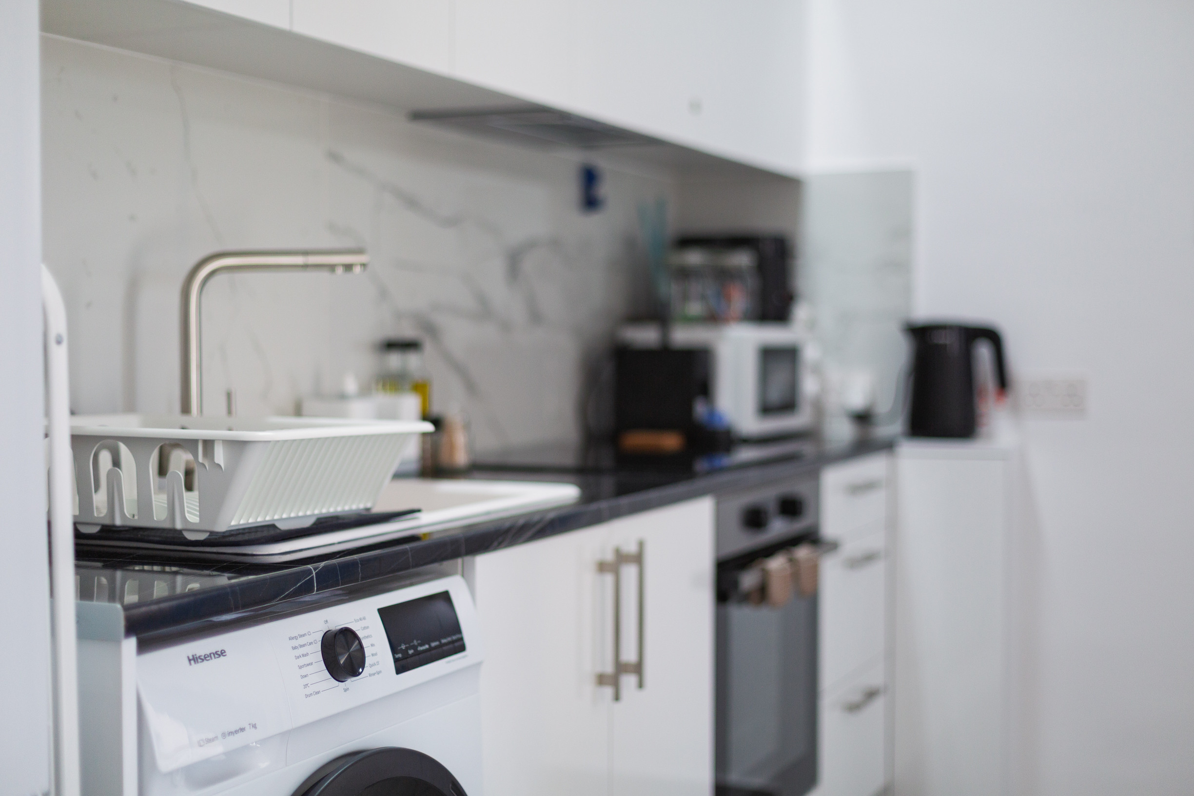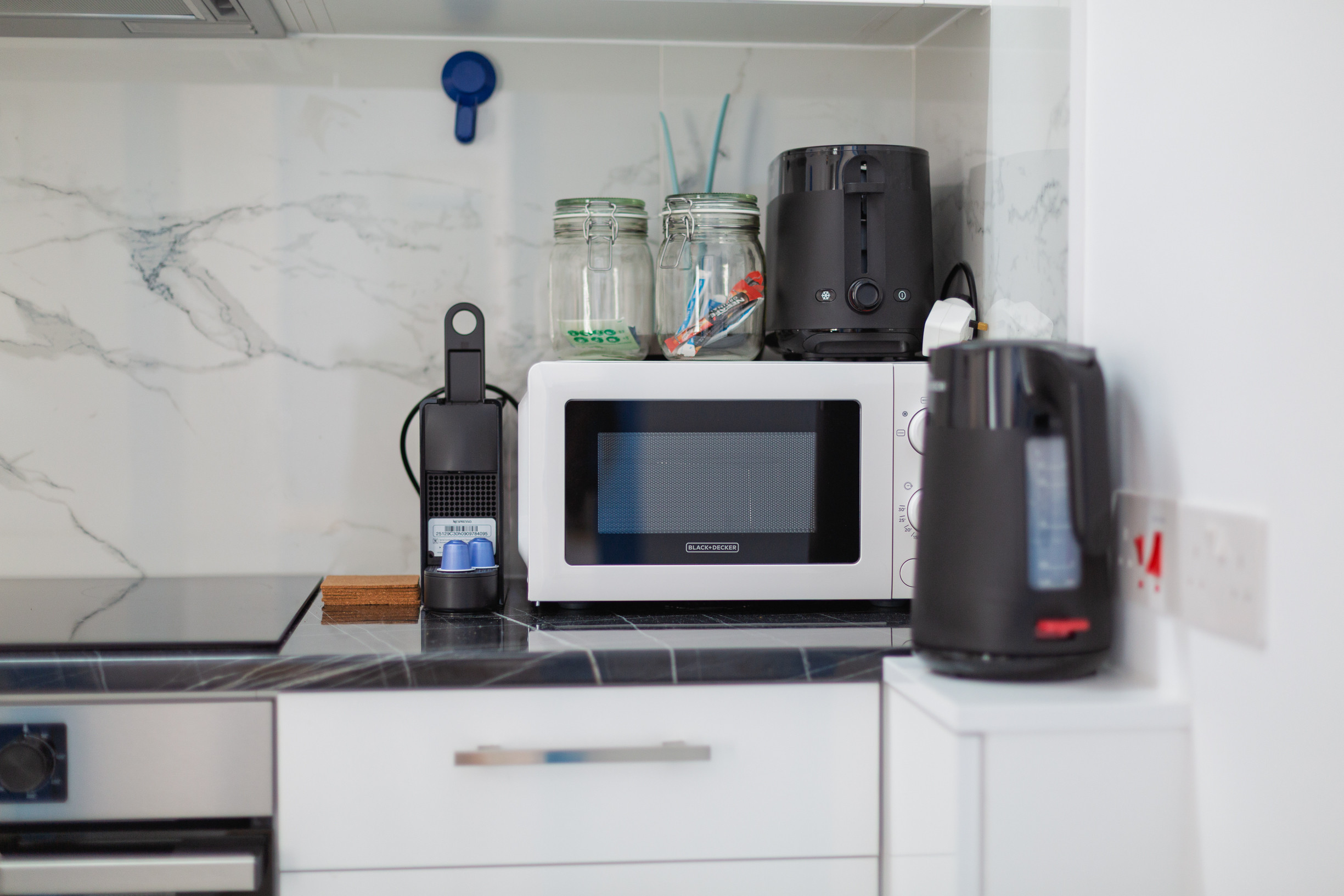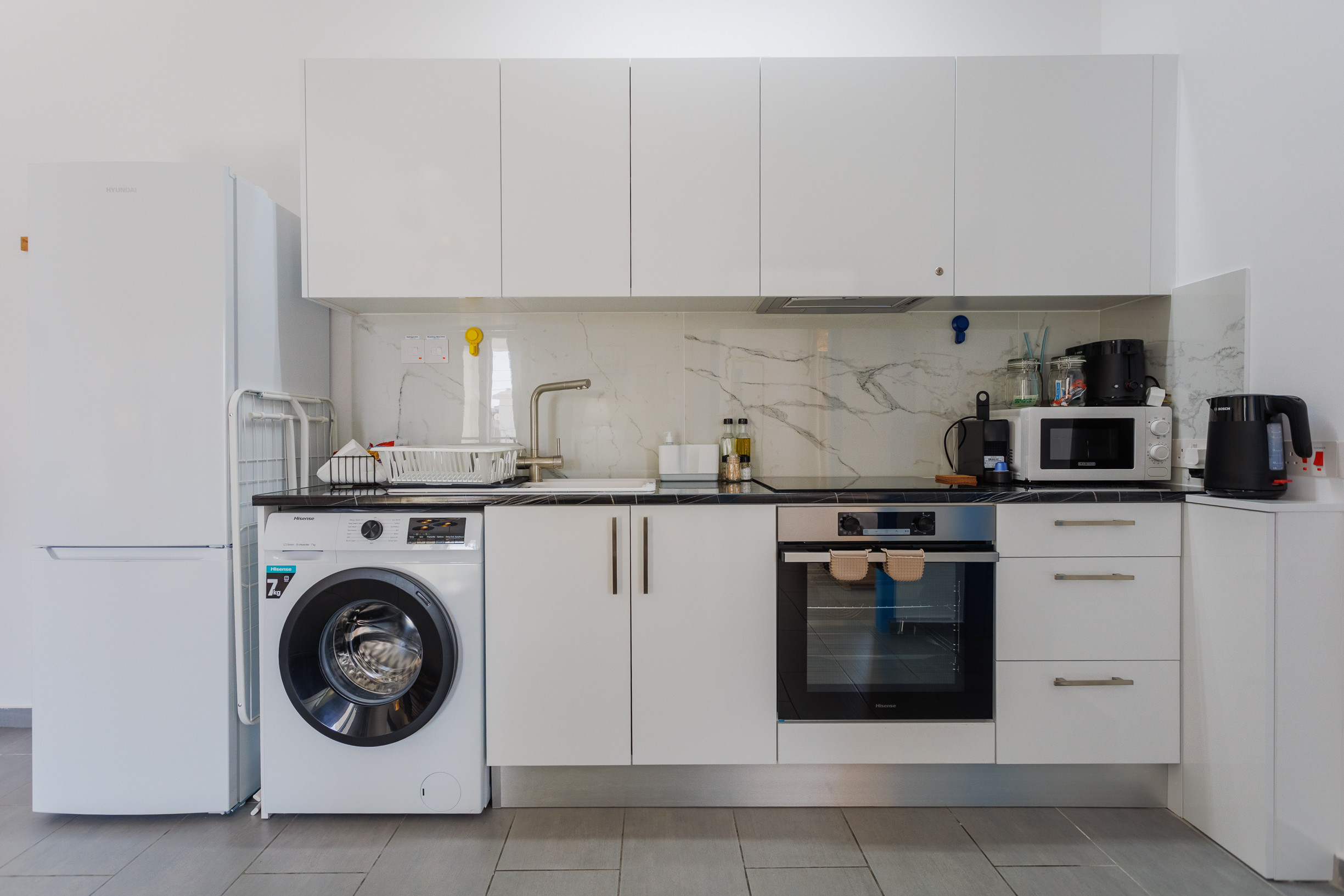 In the electric open plan kitchen, refrigerator, microwave, oven, freezer, dishes/cutlery, kitchen utensils, coffee machine, toaster and kettle are provided.