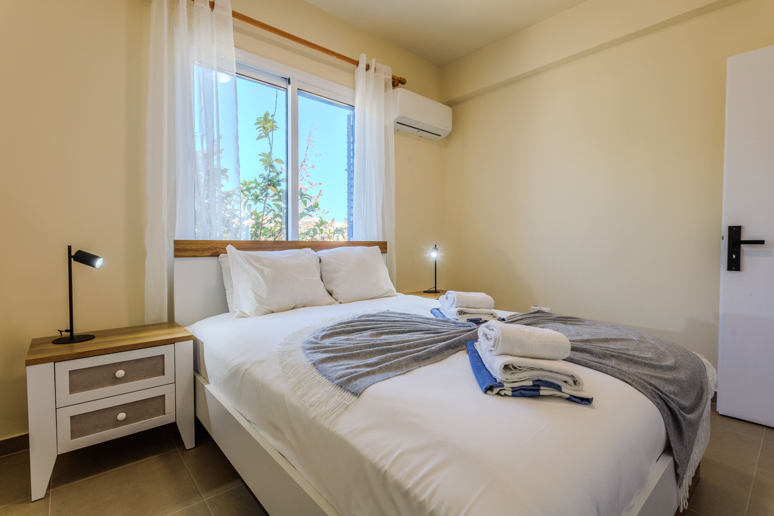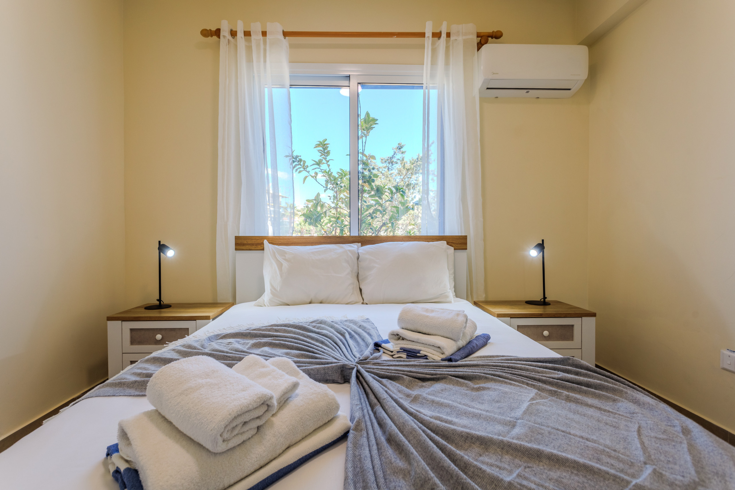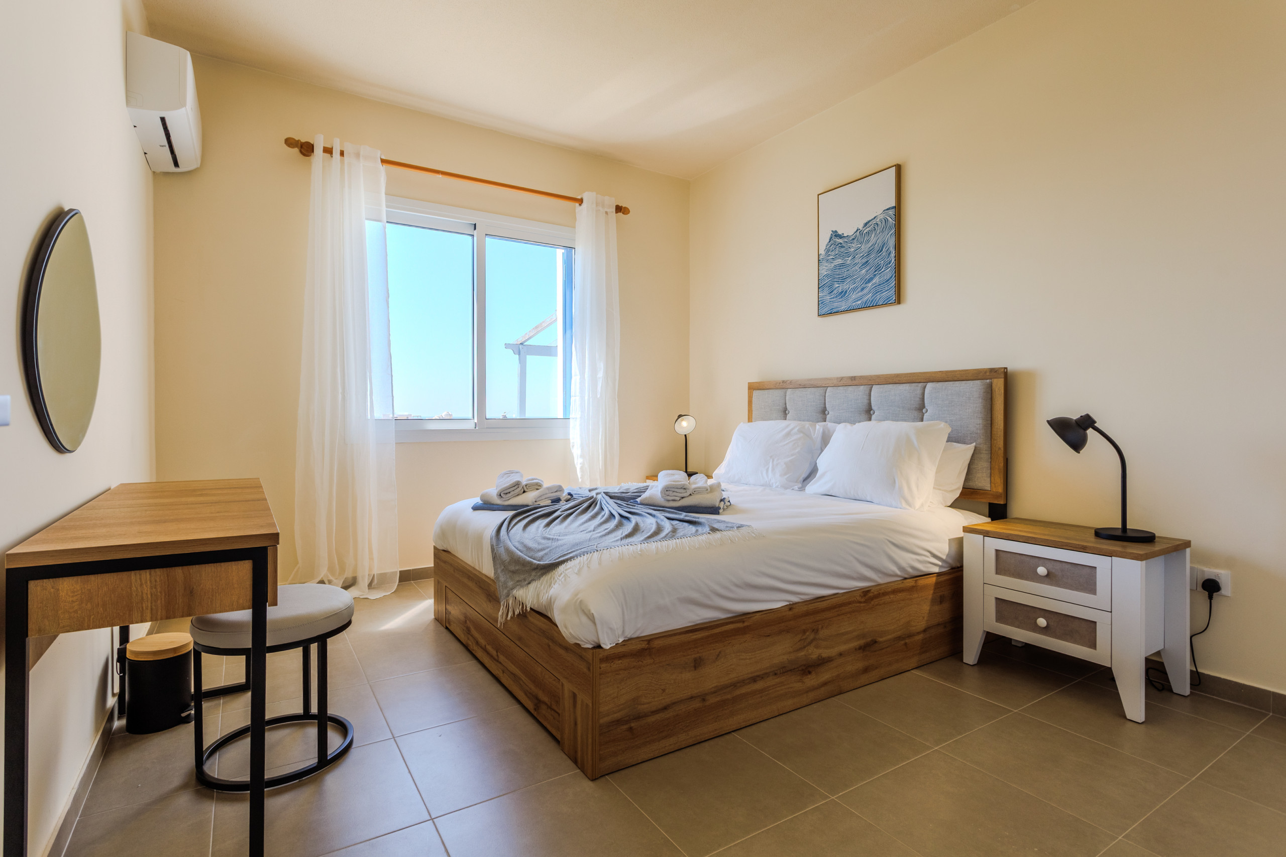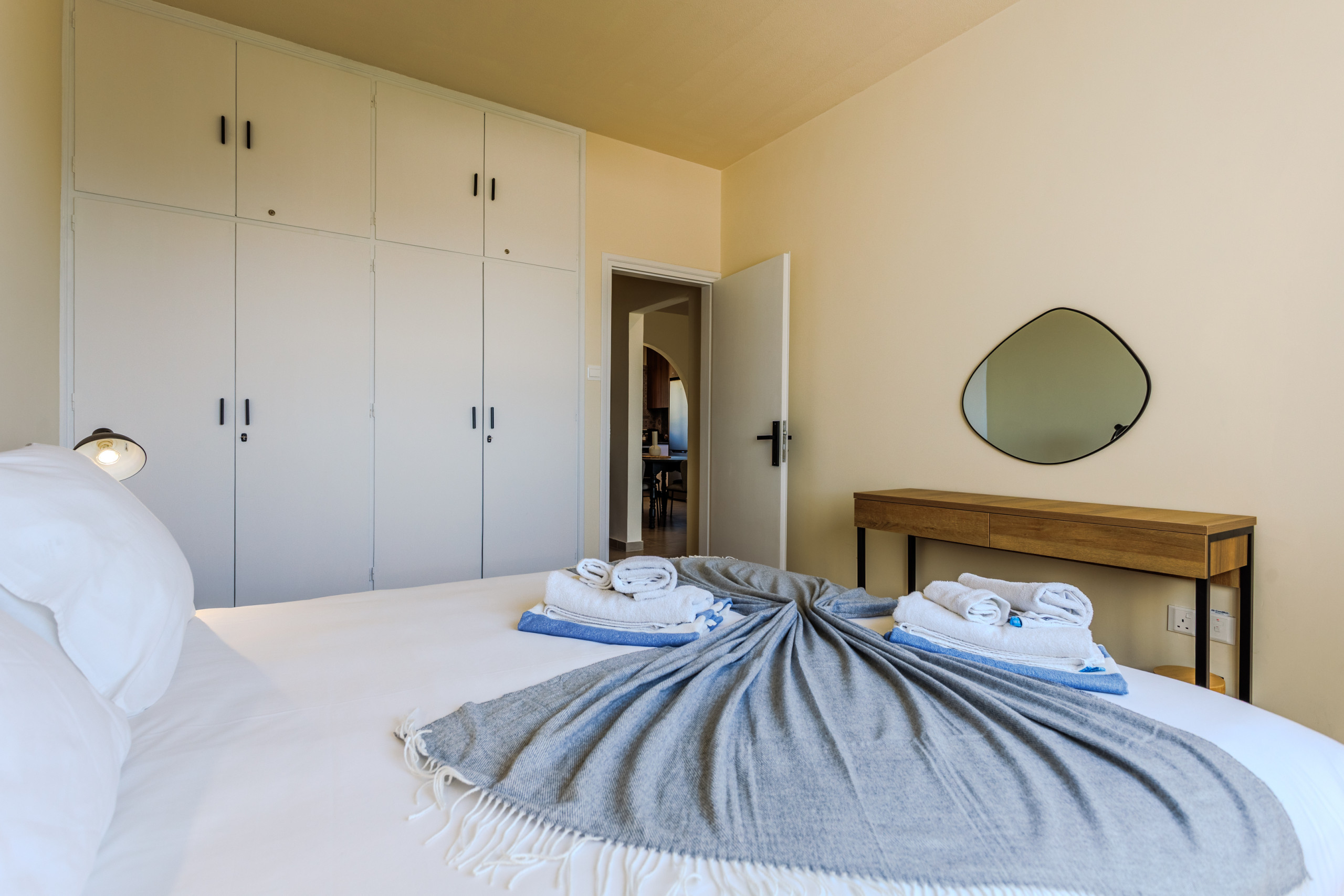 One bedroom has a king sized bed with individual lighting spots, it is air-conditioned and in the wardrobe you will find hangers for your clothes and an electric hair-dryer.