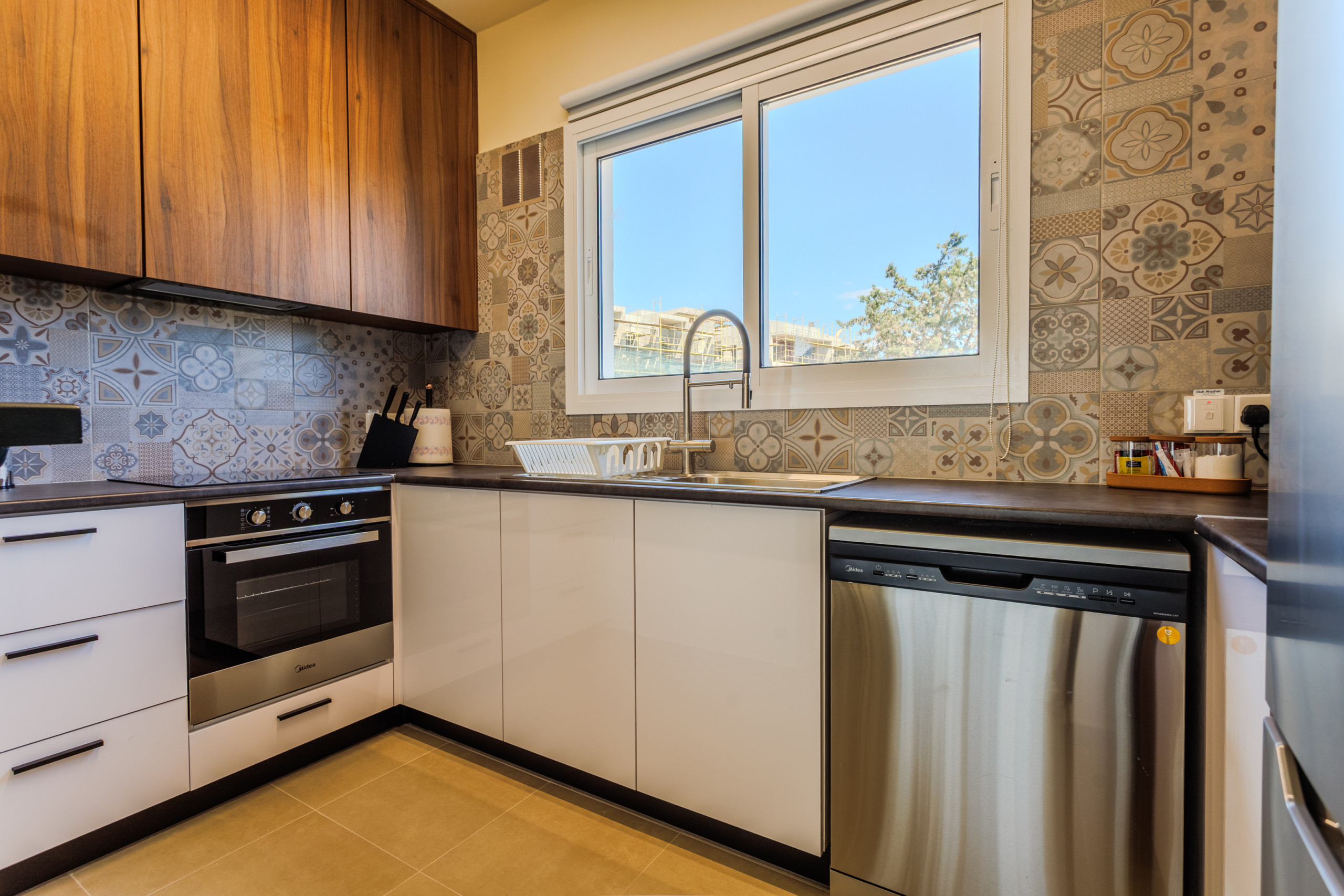 The apartment in Paphos has 2 bedrooms and has capacity for 5 people. The apartment is 70 m². The accommodation is equipped with the following items: washing machine, iron, internet (Wi-Fi), hair dryer, balcony, central heating, air conditioning throughout the house, communal swimming pool, open-air parking the same building, 1 TV.In the open plan kitchen, refrigerator, microwave, oven, freezer, dishwasher, dishes/cutlery, kitchen utensils, coffee machine, toaster and kettle are provided.