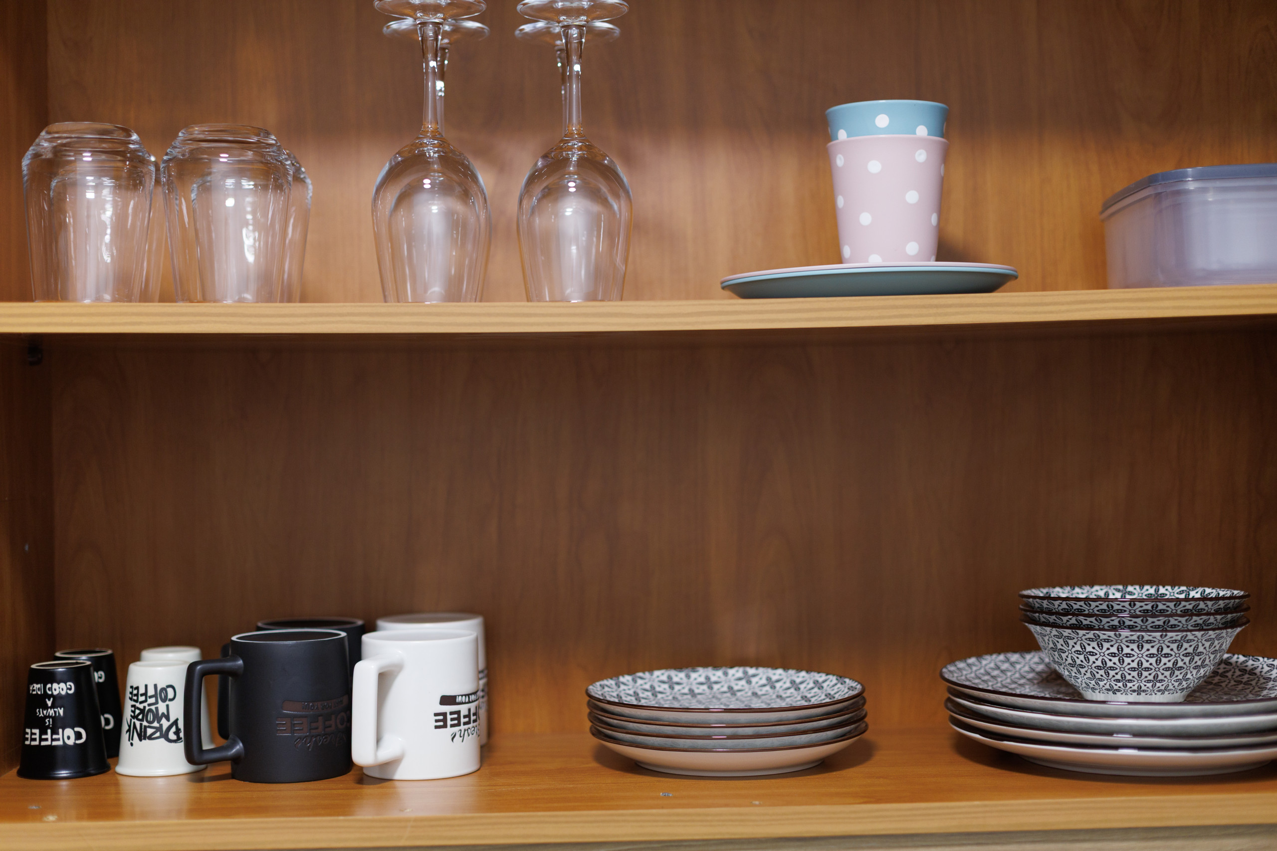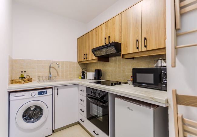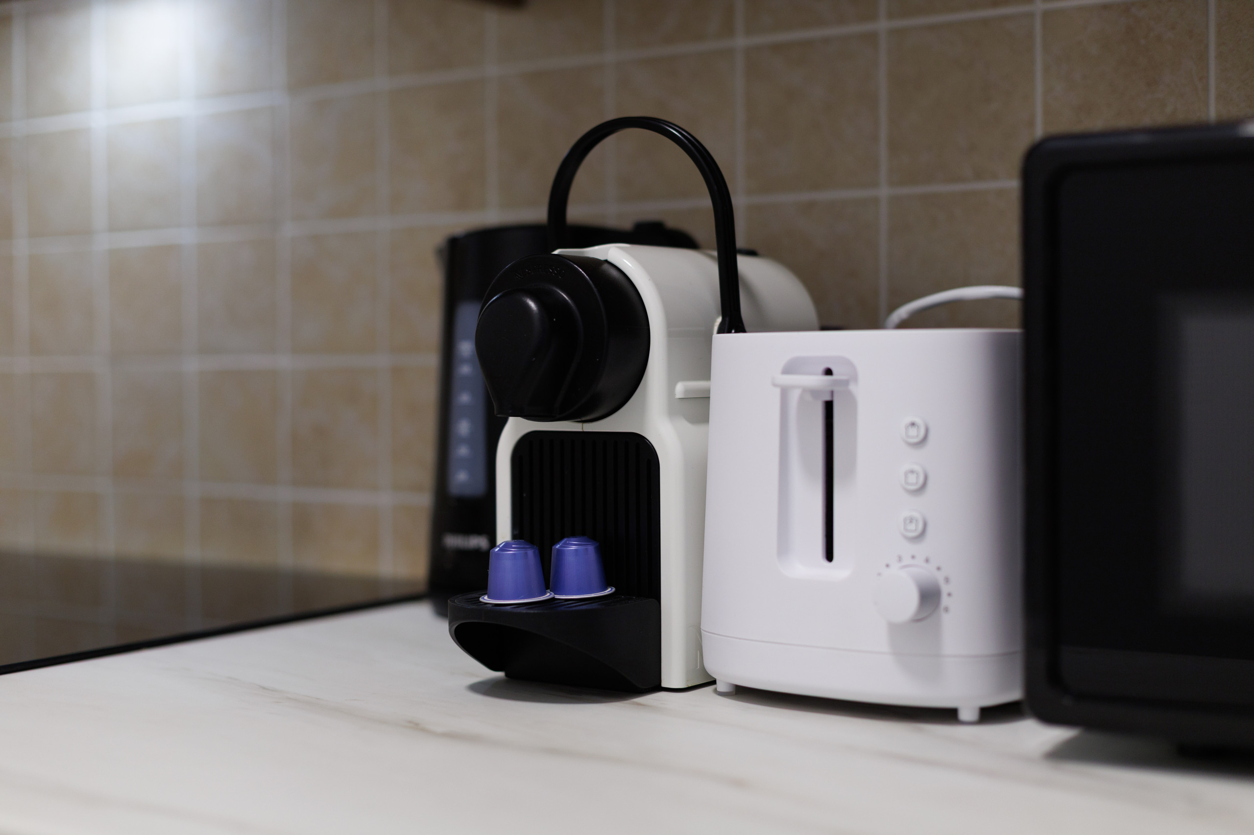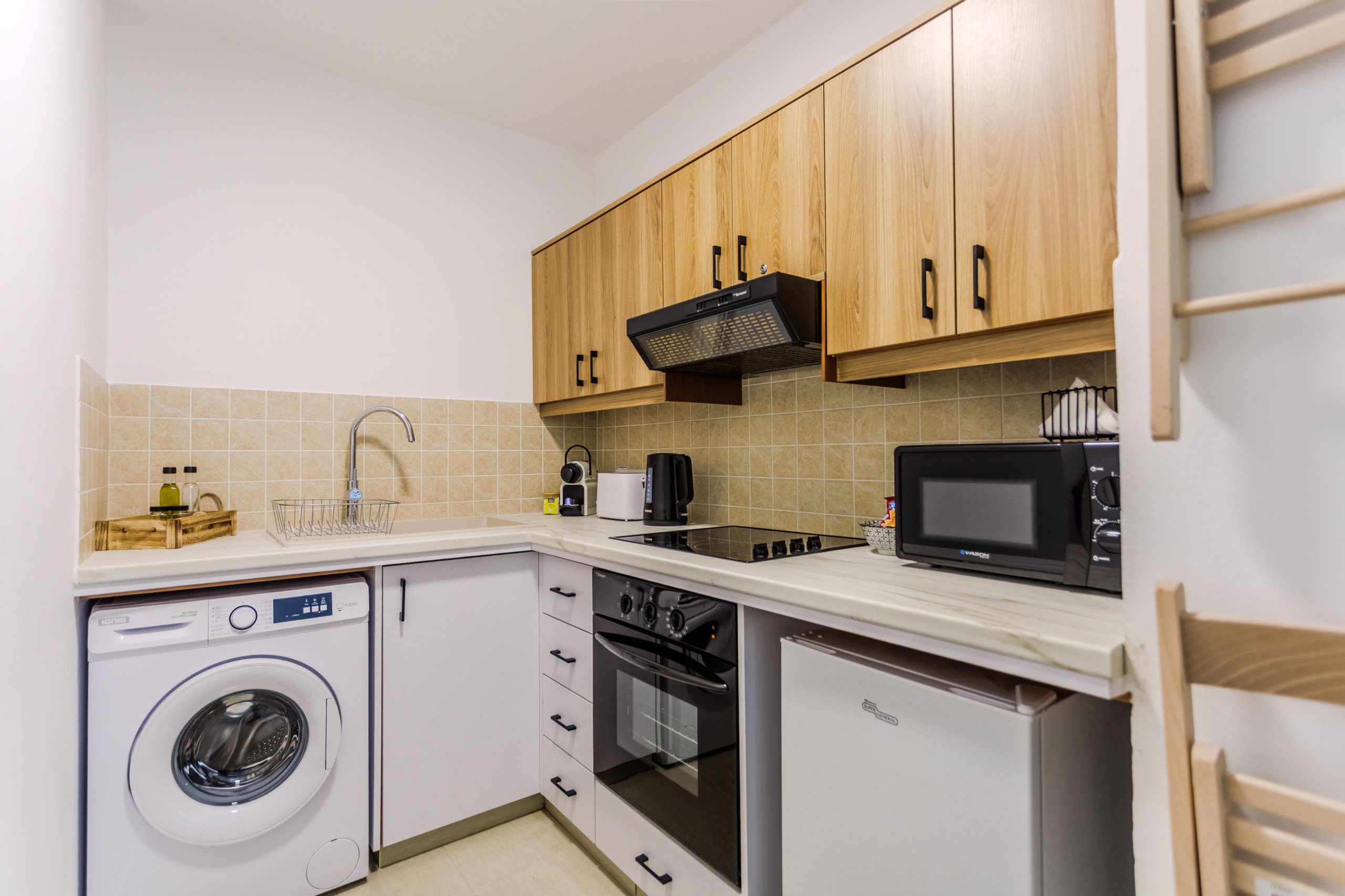 In the electric open plan kitchen, refrigerator, microwave, oven, freezer, dishes/cutlery, kitchen utensils, coffee machine, toaster and kettle are provided.