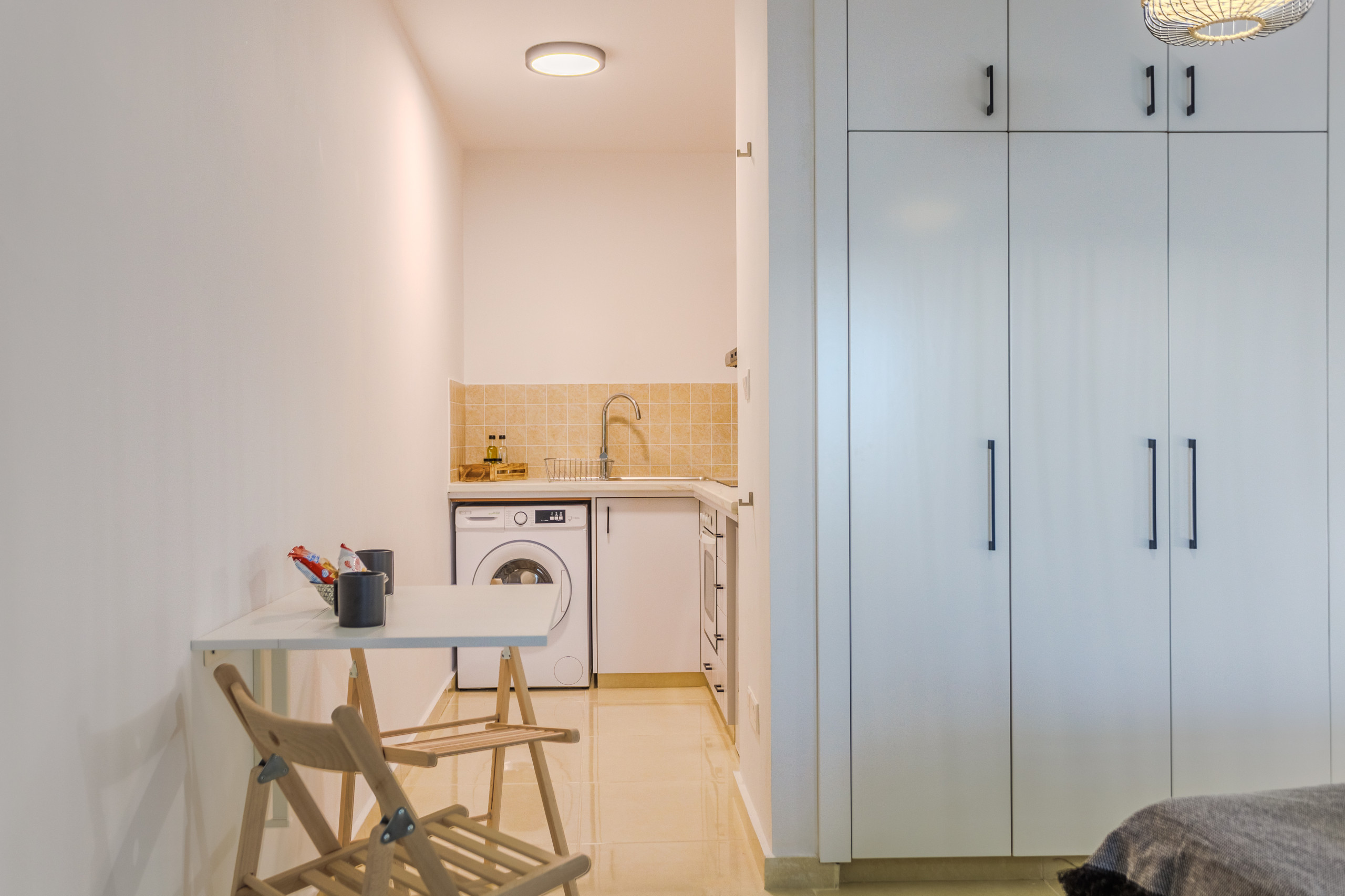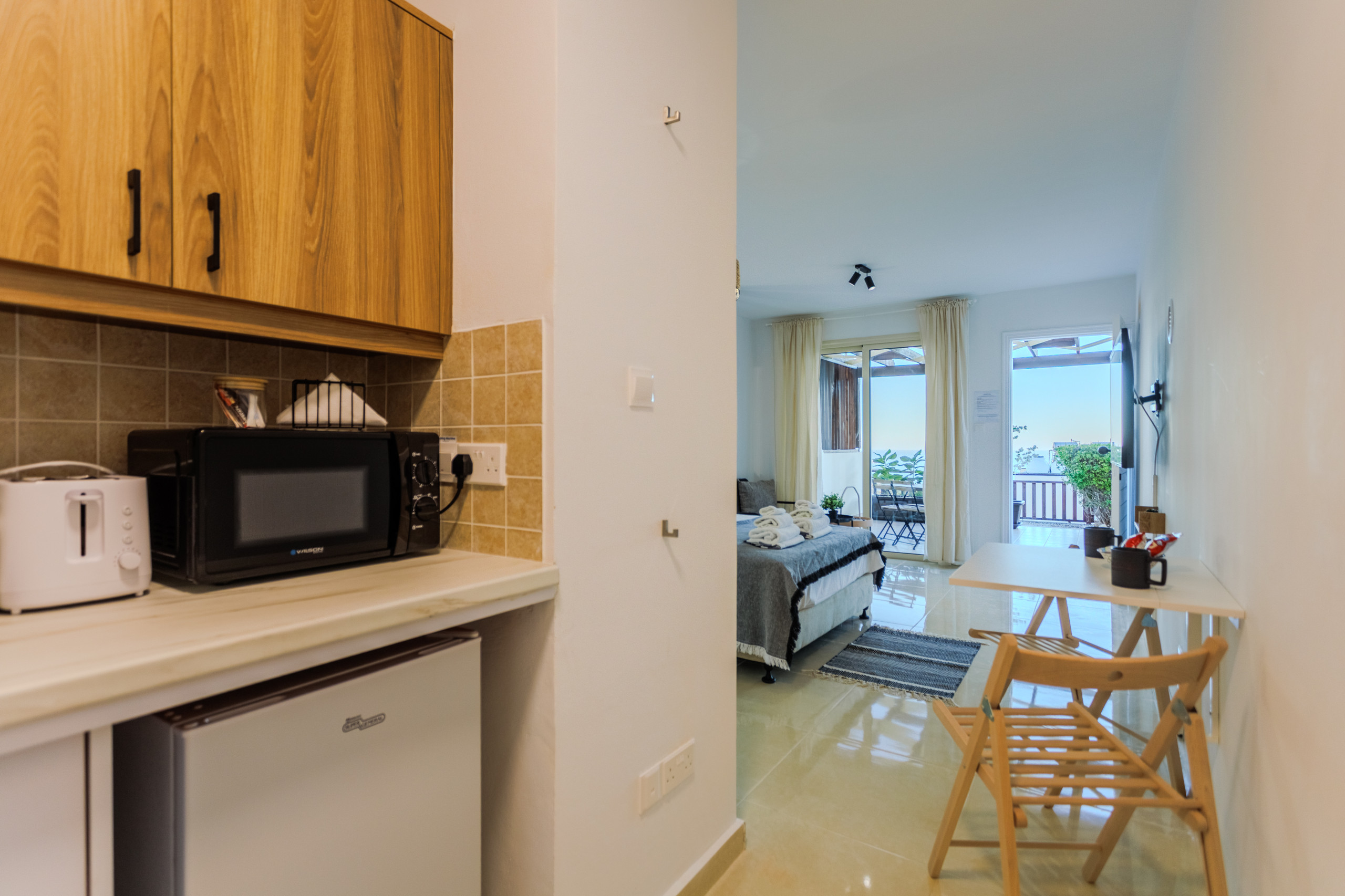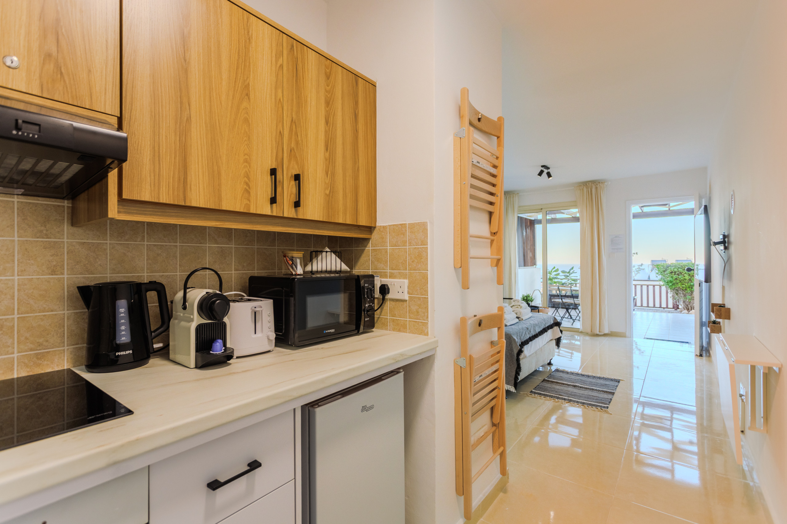 The apartment in Peyia has 1 bedrooms and has capacity for 3 people. The apartment is 12 m². The accommodation is equipped with the following items: garden furniture, washing machine, iron, safe, internet (Wi-Fi), hair dryer, balcony, central heating, air-conditioned, communal swimming pool, open-air parking the same building, 1 TV.In the electric open plan kitchen, refrigerator, microwave, oven, freezer, dishes/cutlery, kitchen utensils, coffee machine, toaster and kettle are provided.