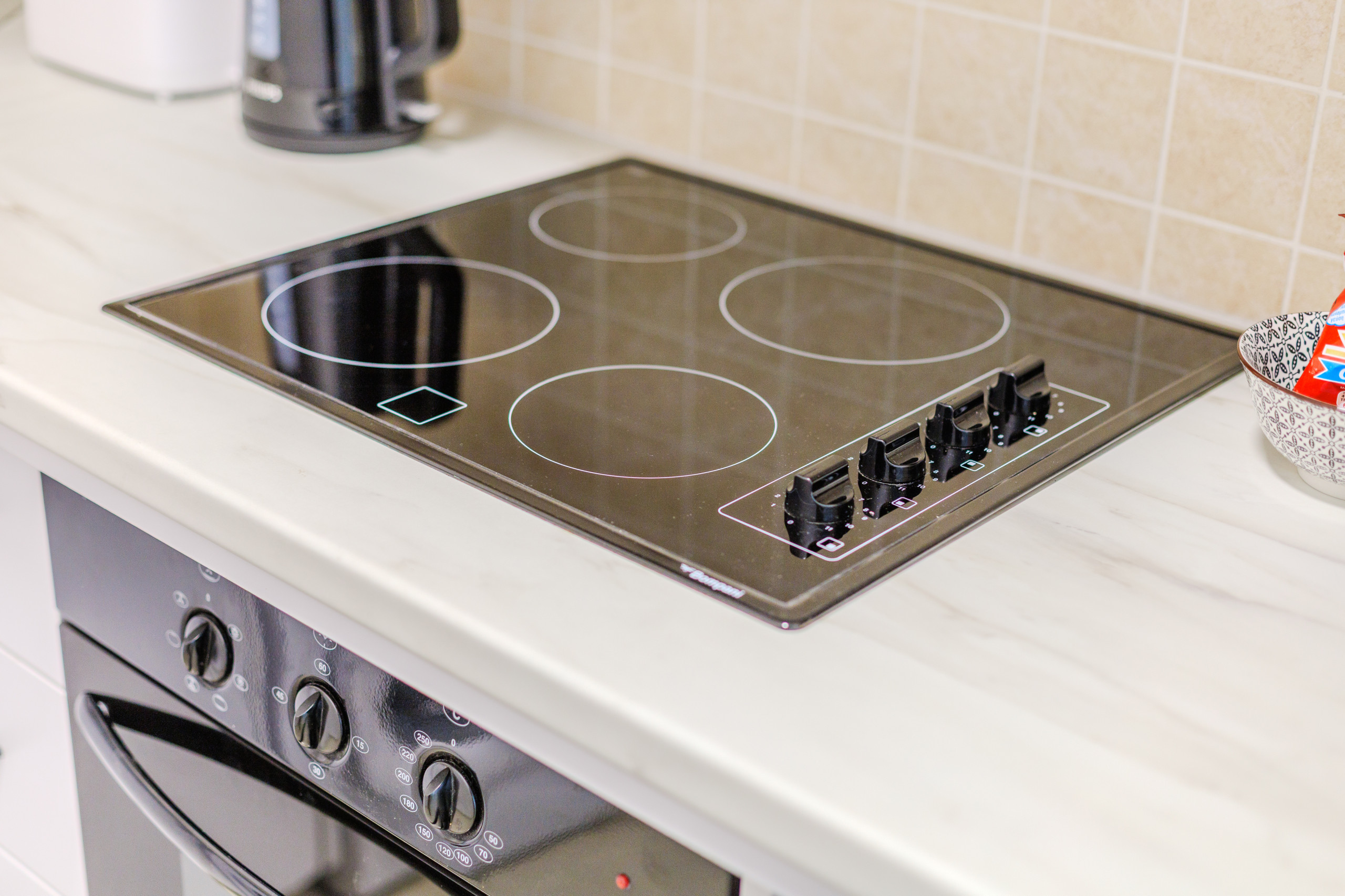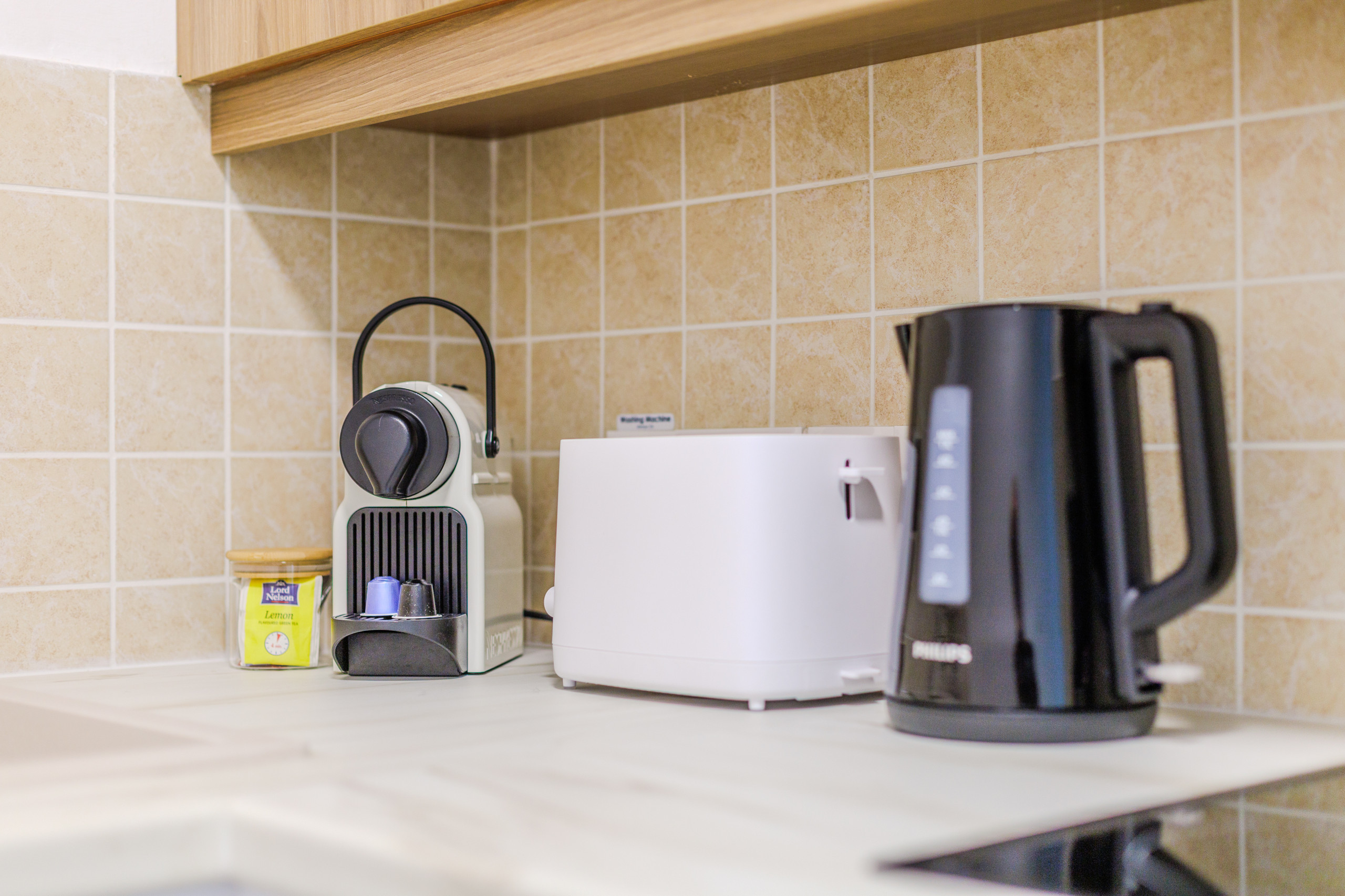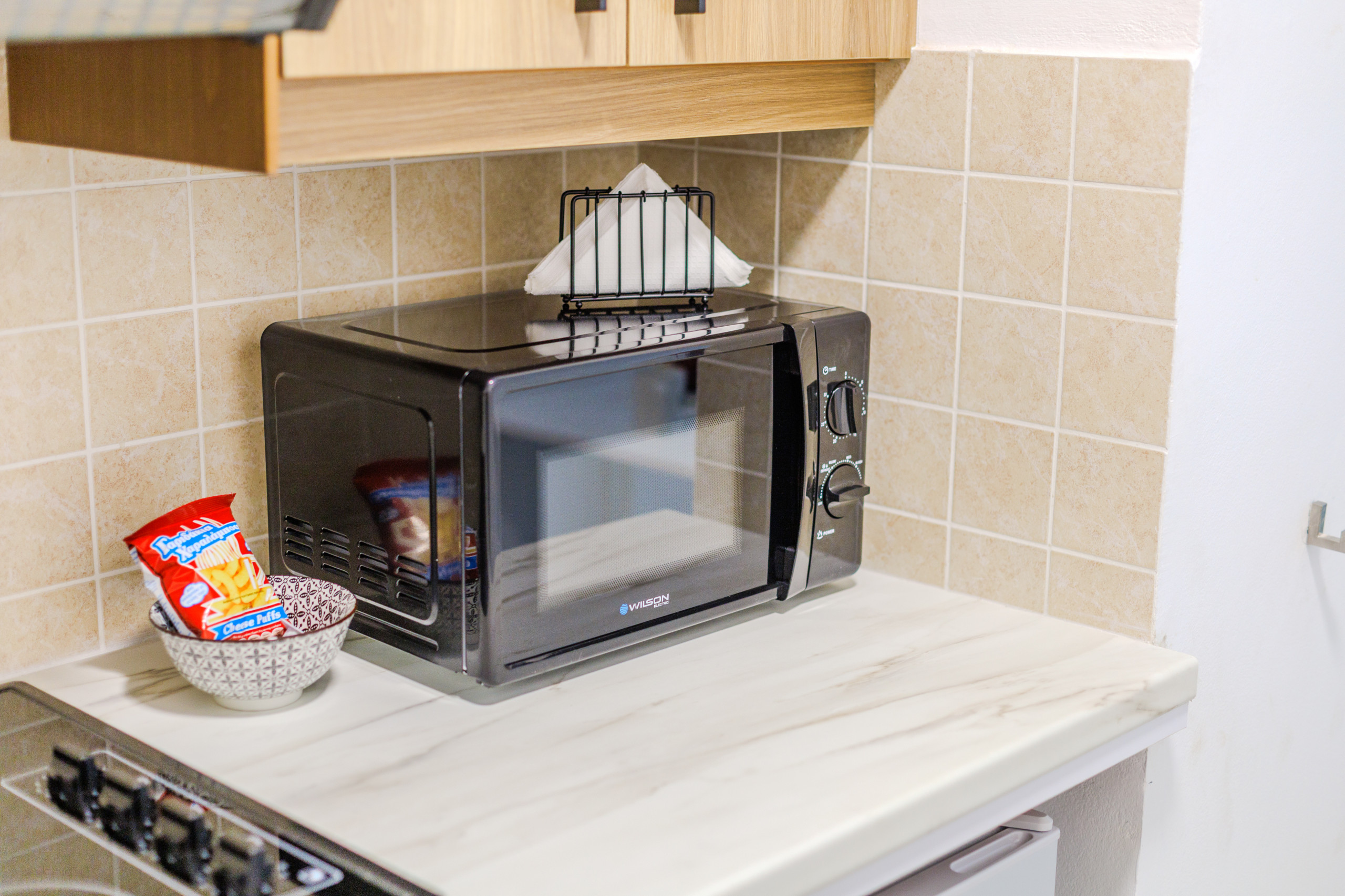 In the electric open plan kitchen, refrigerator, microwave, oven, freezer, dishes/cutlery, kitchen utensils, coffee machine, toaster and kettle are provided.